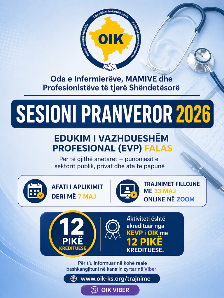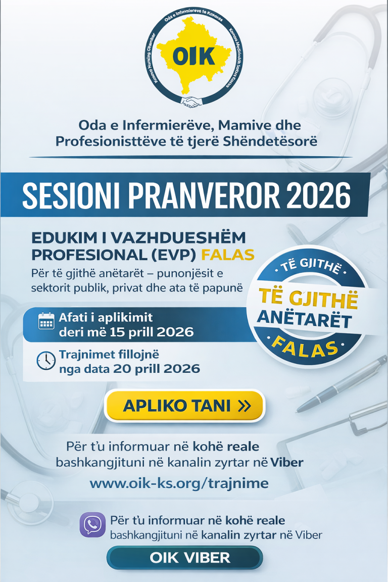 Të nderuar anëtarë, Oda e Infermierëve të Kosovës ju njofton se sot, më 2 shtator 2025, ka filluar zyrtarisht procesi i dërgimit të licencave përmes shërbimit postar. Ky hap është ndërmarrë me qëllim të lehtësimit të procedurave dhe ofrimit të shërbimeve më efikase për secilin anëtar. Licencat do të dërgohen në adresën e deklaruar gjatë aplikimit në platformën elektronike të OIK. Pas miratimit të aplikimit, do të njoftoheni me email...